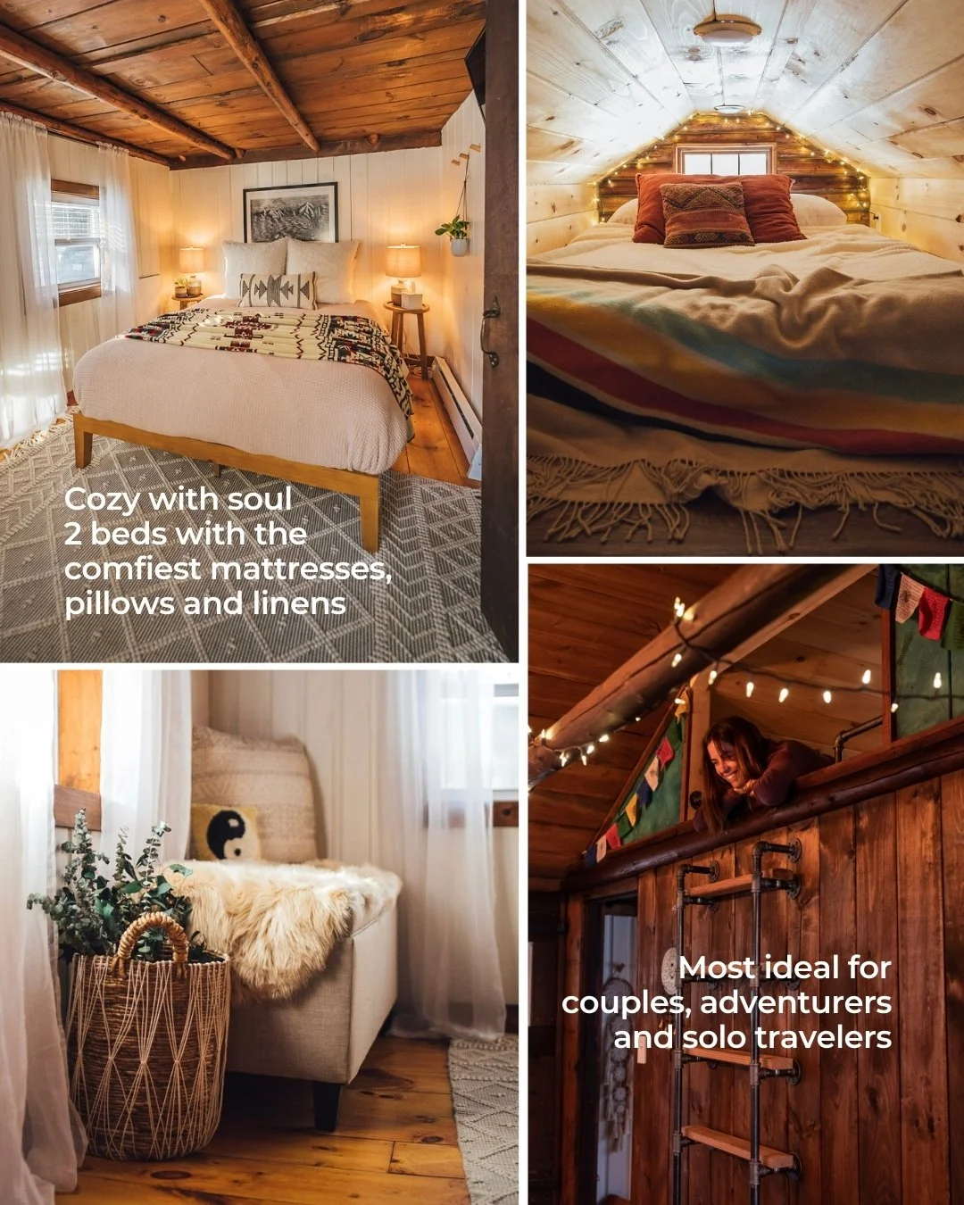 With two sleeping spaces, a dreamy main bedroom and a charming loft, the cabin comfortably welcomes couples, adventurous friends, and solo travelers looking for a peaceful escape.
