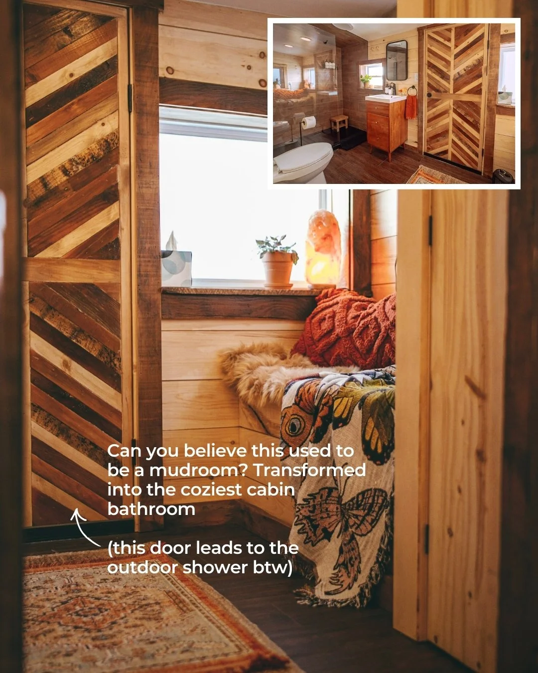 One of the most stunning examples of Cassouki's vision and craftsmanship is the bathroom. What was once a mudroom has been transformed into the coziest, most charming cabin bathroom you've likely ever seen.