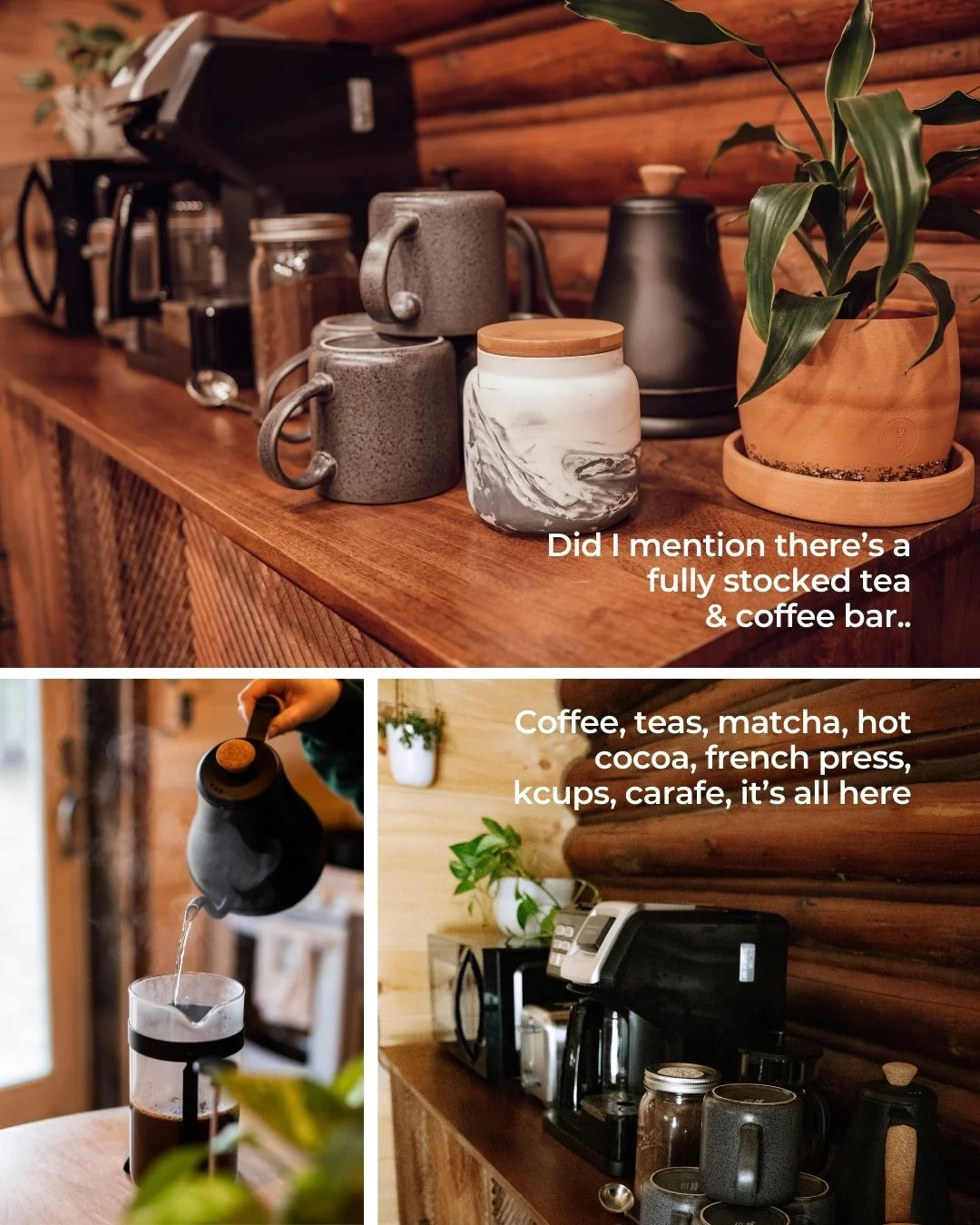 Mornings at the cabin often begin right here. The fully stocked tea and coffee bar includes everything you might crave for a slow start to the day: