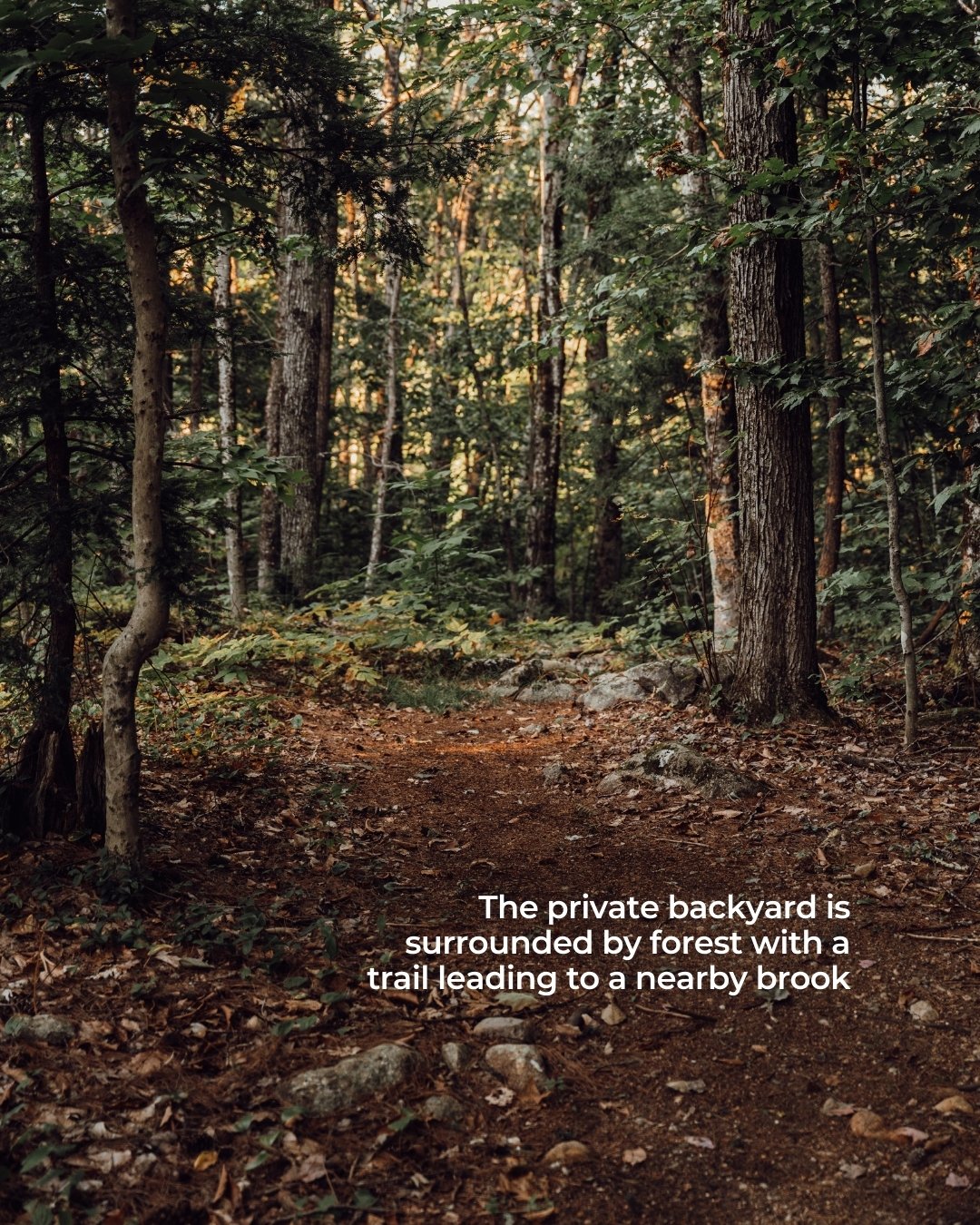 The property doesn't end at the cabin walls, it extends into the surrounding forest, with a hilly trail that winds through the trees and leads to a nearby brook. It's the kind of thing you stumble upon on a slow morning walk and end up sitting by for an hour because you simply don't want to leave.